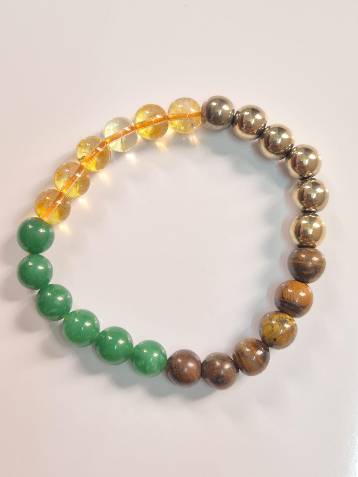 Experience the magnetic energy of Citrine, Green Aventurine, Tiger Eye, and Pyrite combined in one exquisite bracelet. Embrace the confidence, success, and prosperity that follow.