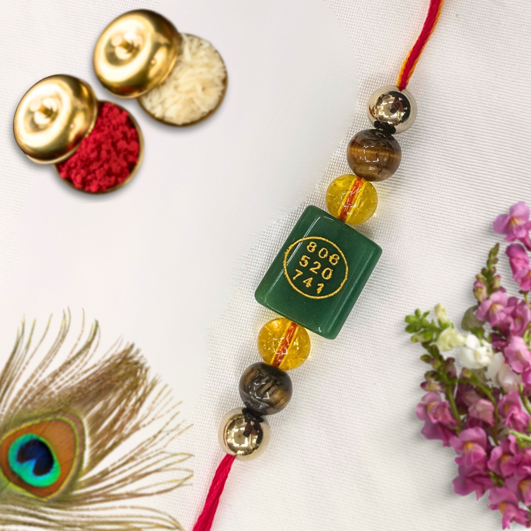 Energized with a sacred Zibu symbol for wealth, this rakhi aligns your brother with divine abundance energies; Zibu is believed to enhance manifestation and karma‑clearing vibrations